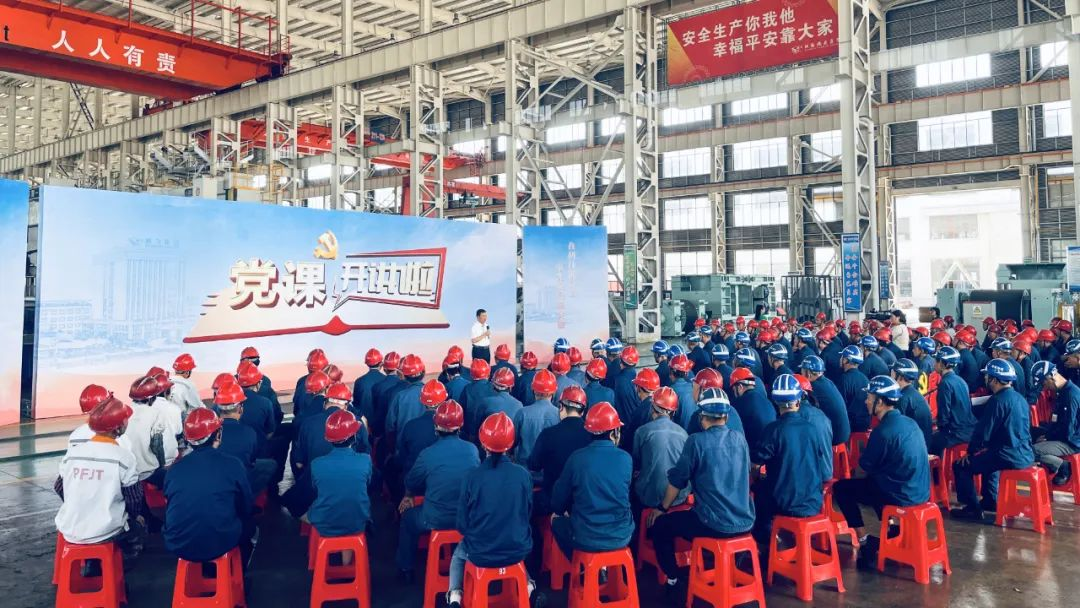 鵬飛集團董事長王家安、副總經理施鵬宇在生產一線為職工上黨課,鼓勵員工不斷加強學習、提高素質、強化安全意識、勇于擔當作為、注重團隊協作
