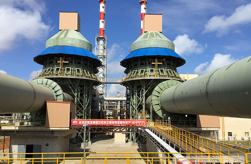 (2)回轉(zhuǎn)窯:回轉(zhuǎn)窯由筒體、支撐裝置、變速傳動裝置、擋輪裝置、窯尾及窯頭密封、窯頭罩組成。窯體與水平呈3.5%傾斜放置。配有兩套支撐裝置,其托輪軸承為水冷式油勺潤滑滑動軸承,并有球面瓦能自動調(diào)心。在靠近大齒圈處還配有液壓擋輪。采用變頻調(diào)速電機(jī)驅(qū)動窯體,并設(shè)有附助傳動驅(qū)動窯體。窯頭窯尾采用彈簧片式密封裝置。采用變頻調(diào)速電機(jī)驅(qū)動窯體結(jié)合預(yù)熱器分解率,有效控制煅燒時間及溫度,達(dá)到生燒和過燒指標(biāo)要求。